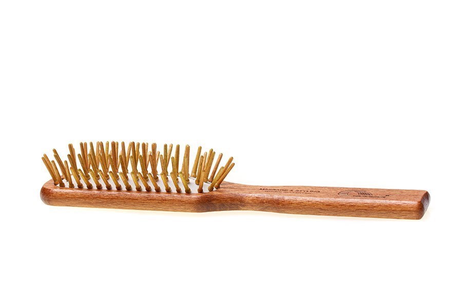 Kvalitná drevená kefa vhodná pre krátke a polodlhé vlasy. Drevené ostne zapustené do pneumatického gumeného podkladu zabezpečujú lepšie "pruženie" štetín a pohodlnejšie česanie aj riedkych a krátkych vlasov.
