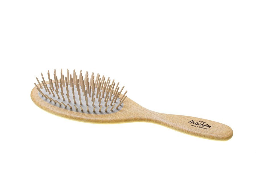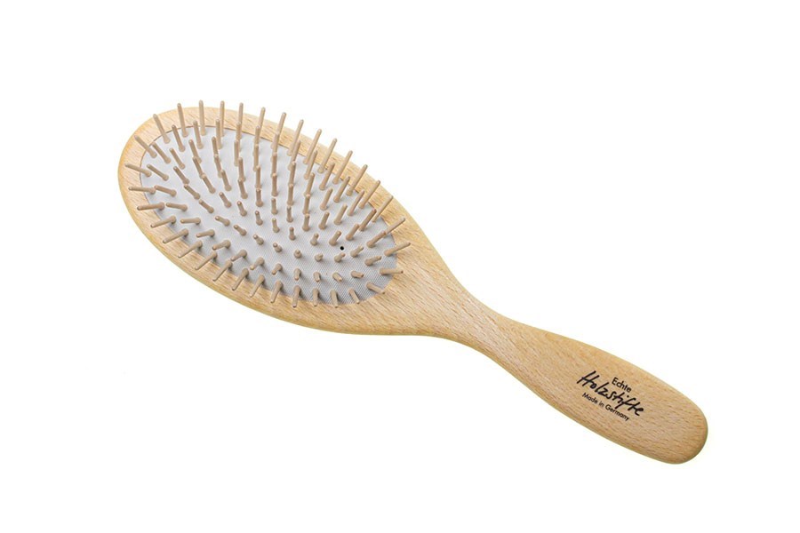 Oválna kefa na vlasy z bukového dreva. Drevené ostne zapustené do pneumatického gumeného podkladu zabezpečujú lepšie "pruženie" a pohodlnejšie česanie hustých vlasov.