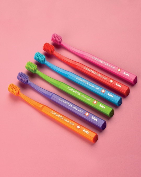 Šetrná a účinná detská zubná kefka Curaprox Ultrasoft (CS KIDS) s jemnými štetinkami. Má skrátené vlákna, takže je odolnejšia voči tlaku a prílišnému opotrebovaniu. Určená pre deti od 4 rokov.