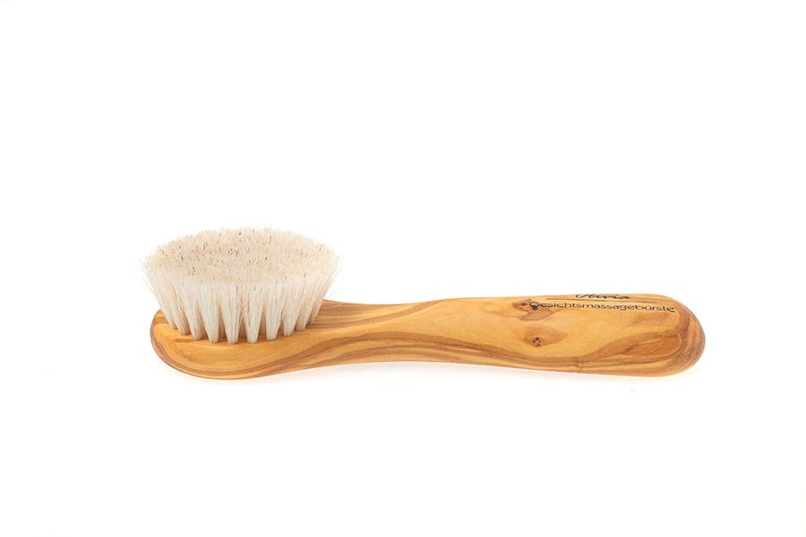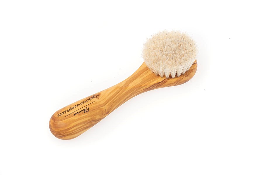Originálna drevená masážna kefka na tvár - na čistenie aj masírovanie. Vyrobená z prírodných materiálov - olivové drevo a mäkké konské vlasy.