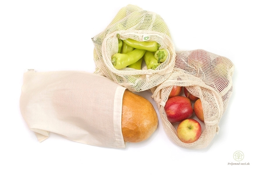 Sada obsahuje dve sieťové a jedno plátené vrecko vyrobené z biobavlny. Sú vhodné na prenos pečiva z obchodu domov, na zeleninu, ovocie.