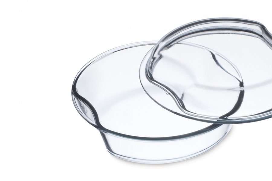 Sklenená okrúhla zapekacia misa. Obe časti sa dajú využiť ako pekáče na prípravu jedál v rúre alebo sa jedna časť využije ako vrchnák na prikrytie.