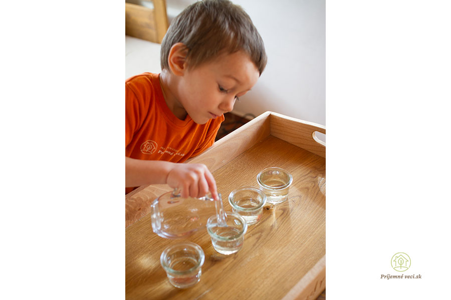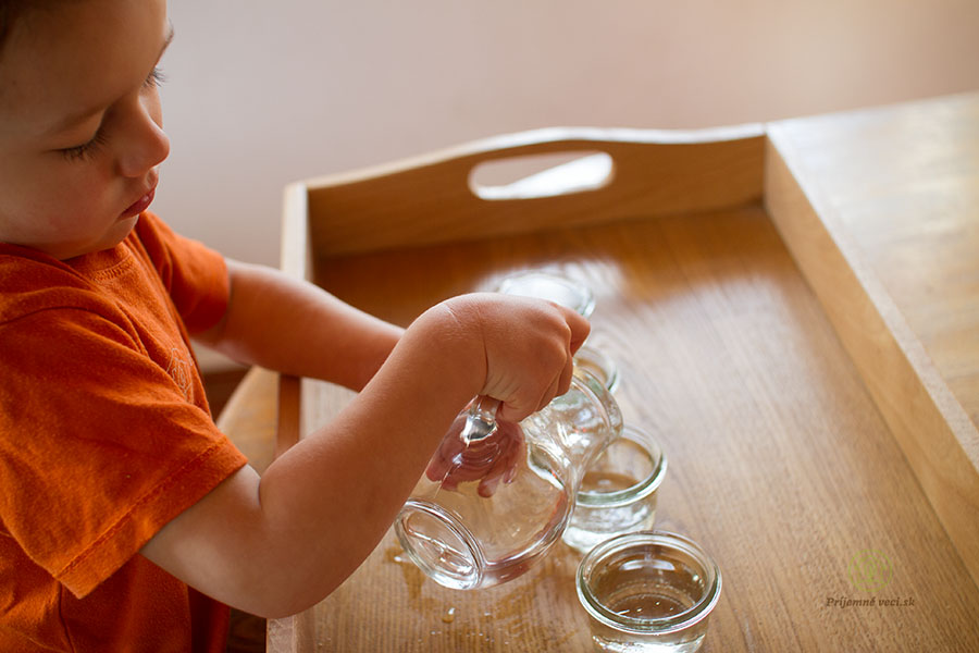 Krčah z hrubostenného skla je však aj skvelou pomôckou pri nácviku nalievania a presýpania v Montessori pedagogike. Je malý, takže aj plný džbán vie dieťa samo dvihnúť a naliať si do pohára vodu.
