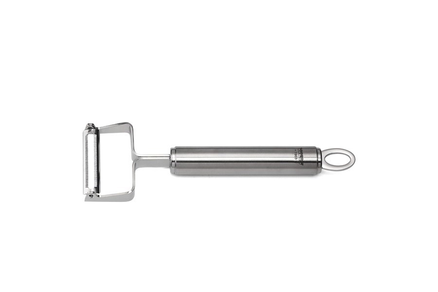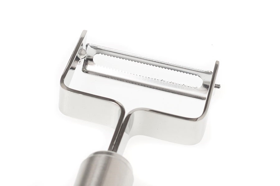 Nerezová škrabka na zeleninu s ostrou a pohyblivou čepeľou s jemnou hrúbkou rezu.