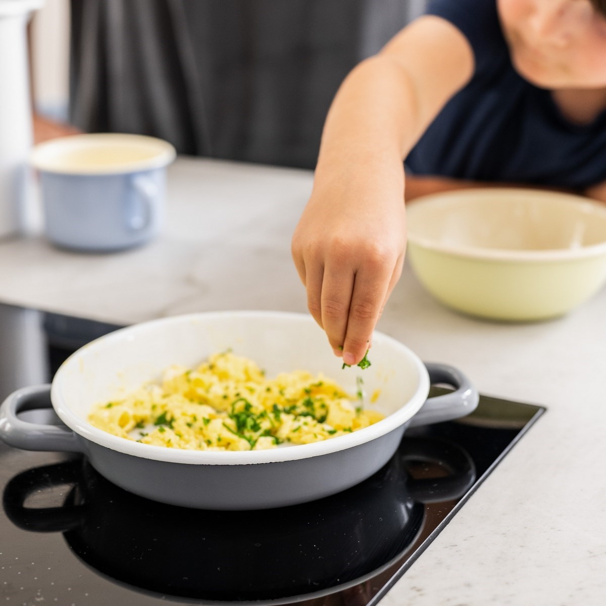 Železné jadro smaltovanej panvice optimálne a rýchlo rozvádza teplo na dne panvice, takže teplota sa dá rýchlo znížiť, pretože vaječné pokrmy neznášajú príliš vysoké teploty.