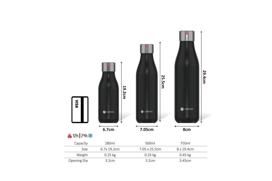 Dvojstenná (2x nerezová stena + izolačná vrstva z medi + termoizolačná vrstva) termoska z nerezovej ocele 18/10 je zdravou voľbou na nosenie vody stále so sebou. Vyhnete sa kupovaniu nápojov v plastových/tetrapakových obaloch.